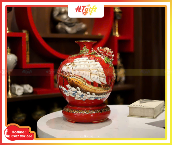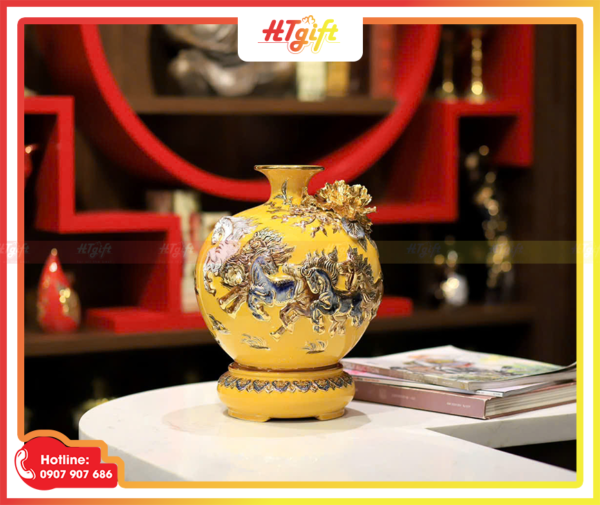 Bình được chế tác từ gốm sứ cao cấp, ứng dụng kỹ thuật đắp nổi thủ công kết hợp dát vàng tinh xảo, tạo chiều sâu và độ sang trọng nổi bật. Trên thân bình là các hình tượng phong thủy cát tường như Mã đáo thành công, Bát mã truy phong, Thuận buồm xuôi gió, Công danh phú quý… – biểu trưng cho sự thăng tiến, thành công và phát đạt bền vững.